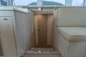 The IS525e features a state-of-the-art energy management system that optimizes power usage, ensuring the range and reliability needed for long-distance cruising. The 55kw generator can charge the drive batteries in about four hours. For long-distance passages, the batteries offer a range of about 80 nautical miles at six knots and the generator can add another 1000 nautical miles. While dockside, the Island Spirit 525e can charge with 50 amp shore power or the high-speed CCS2 charger.