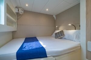 Each cabin features queen-sized walkaround beds, ensuring a premium level of comfort for all guests. Gas-assisted hinges make accessing the large under-bed storage compartments effortless.