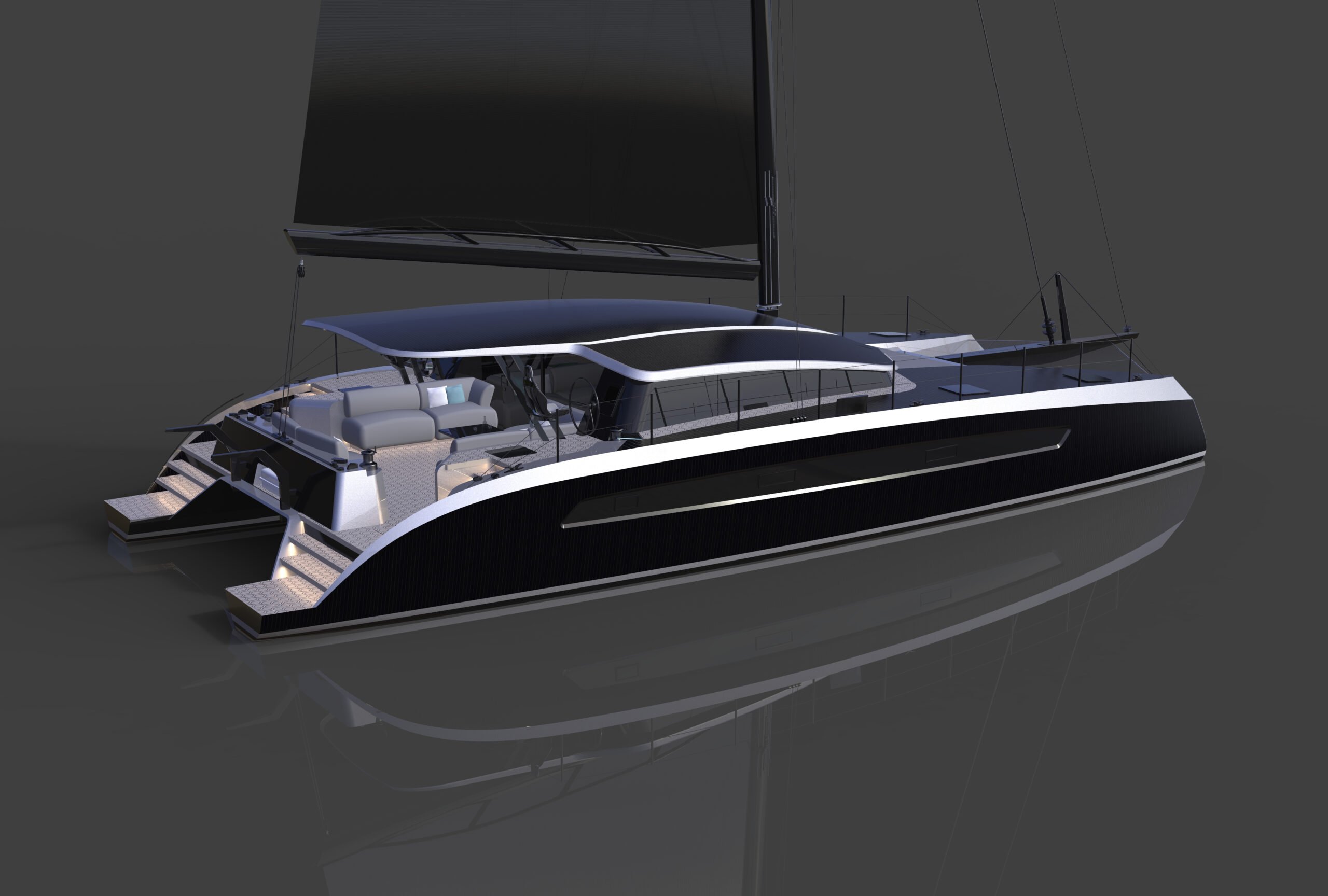 The future of luxury sailing is silent, swift, and reliable. Sail farther, faster, and greener aboard the Panther 68, a high-performance carbon fiber catamaran with next-generation electric propulsion. Exclusively available through Inspired Yachting. Constructed entirely from carbon‑epoxy, this lightweight yacht features striking black topsides and silver sheer lines, embodying both elegance and eco‑efficiency.